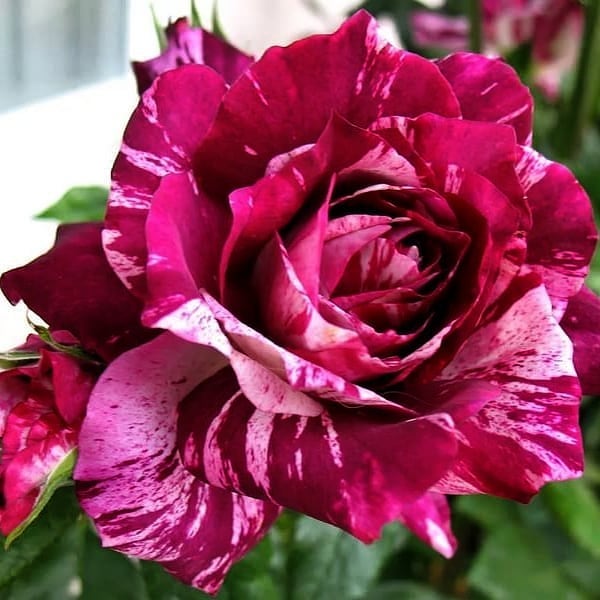 Purple Tiger (JACpurr, Impressionist)Christensen США, 1991ФлорибундаОписание:Показать полностью…Полосатые розы стали одним из великих открытий в 1980-х и 1990-х годах. Все начали их выводить, так что сорта должны были быть хорошими, чтобы выдержать жесткую конкуренцию. Purple Tiger уникален по своей окраске – невероятная смесь пурпурно-лилового и белого, с пятнами и потеками, очень непостоянная и неровная, часто с добавлением розового и сиреневого. Но пурпурный является доминирующим цветом, и это большой подарок для цветочных аранжировщиков. Цветки обычно появляются в кистях по 3-5 шт, повторное цветение наступает очень быстро, так что куст практически весь сезон украшен цветами. Сорт несколько подвержен черной пятнистости, куст компактный, ветвистый и прямостоячий. Дополнительное преимущество – практически не имеет шипов.Это единственная полосатая роза в пурпурных тонах, которую я знаю. Даже несмотря на подверженность мучнистой росе и черной пятнистости, и на то, что роза не слишком сильная, цветки стоят того.Этот новый сорт цветет цветками замечательной пурпурной окраски с белыми и сиренево-розовыми потеками. Цветет небольшими кистями все лето, цветки полумахровые, из 26-40 лепестков, ароматные. Листва блестящая, куст невысокий, почти без шипов.Цветок раскрашен радиальными полосками пурпурного и белого цвета. Цветки из 25 лепестков, не более 6 см в диаметре. Раскрывшись, имеют плоскую форму. Приятный, несильный аромат с нотками с нотками мускуса. Кистевидные соцветия (до 12 цветков) возвышаются над листвой. Сорт цветет почти непрерывно, невысокий (редко бывает выше 75 см), достаточно мощный куст. Листья светло-зеленые, редкие. Используется в смешанных бордюрах или местах для чего-то необычного. Листья и кусты не отвечают самым высоким стандартам.